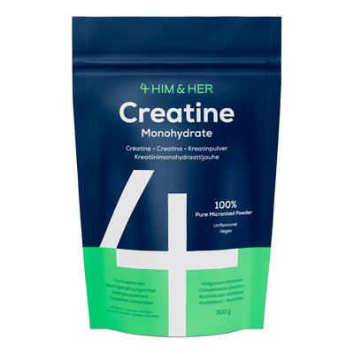 4HIM & HER Creatine Monohydrate er et kosttilskud med 100 % rent kreatin monohydrat i pulverform. Pulveret er smagsneutralt. En bøtte på 500 g giver 147 portioner à 3,4 g.