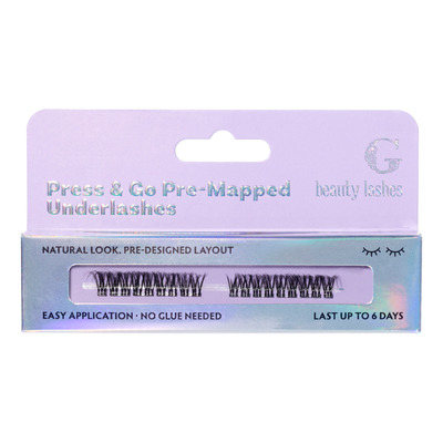G Beauty Press & Go Pre-Designed Underlashes er selvklæbende vipper, der er forudformet i nøje udvalgte længder fra inderst til yderst. Vipperne placeres under dine egne vipper og aktiveres af hudens varme og fugt. De binder sig let fast uden brug af lim. Resultatet er et holdbart og naturligt udtryk, der holder i op til 6 dage og kræver minimal indsats.