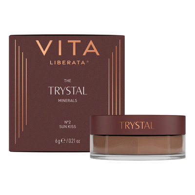 Vita Liberata Trystal Minerals No. 2 er vegansk og uden talkum. Den er skabt til daglig brug og kan anvendes over hele ansigtet som en holdbar og silkeblød mineralpudder. Farven Sun Kiss Medium er den midterste nuance i serien.
