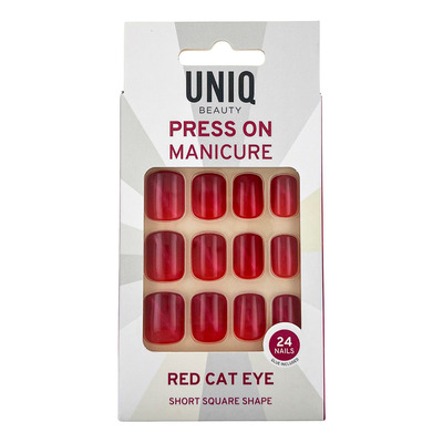 UNIQ Press-On Negle med Lim Red Cat Eye er et sæt elegante, korte negle med firkantet form og en intens rød farve. Den iøjnefaldende cat eye-effekt giver en smuk glans og illusion af dybde. Designet er både dramatisk og stilfuldt, og det passer perfekt til fest eller en aften ude. Neglene er nemme at tilpasse og sætte på uden brug af UV-lampe.