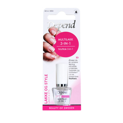 Med Depend Multilak 3-in-1 får du både en basecoat, topcoat og styrkelak i ét produkt, så du både sparer tid og besvær. Lakken er altså en super enkel løsning, som styrker og beskytter dine negle samtidig med, at din neglelak kommer til at holde længere. Depend Multilak 3-in-1 er særligt velegnet til dig, der i forvejen har en fin neglekvalitet, men vil beskytte neglen mod eksempelvis vand, som kan gøre neglen blød og porøs.