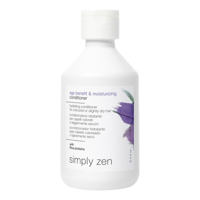 Simply Zen Age Benefit & Moisturizing Conditioner er særlig udviklet til farvet og lettere tørt hår. Balsammen efterlader håret blødere og med mere fylde. Den indeholder hyaluronsyre, proteiner og et UV-filter, der virker plejende og beskyttende på håret. Derudover indeholder den også risproteiner, som efterlader håret blankt og let at rede ud.