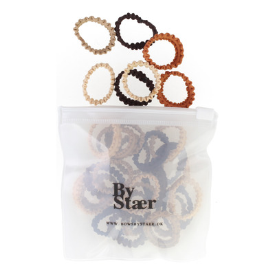 By Stær Mini Hårelastikker - Mix 11 - 50 stk. er fleksible minielastikker i jordnære farver, der pynter i håret