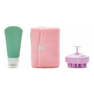 Dette smarte rejsesæt fra Parsa Beauty indeholder tre praktiske musthaves til din hårpleje, uanset hvor du er. Sættet består af en blød og hurtigtørrende hårturban i mikrofiber, en genopfyldelig 60 ml. flaske til shampoo eller balsam samt en ergonomisk hovedbundsbørste, der stimulerer blodcirkulationen og giver en skånsom massage.