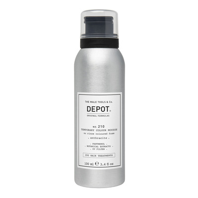 Depot 210 Temporary Colour Mousse er særlig udviklet til mænd med hvidt eller gråt hår. Skum farven giver en hurtig og midlertidig farve til et hvidt eller gråt hår. Skummen indeholder antracitpigment og tilfører fugt og pleje til håret. Den giver en afbalanceret hårfarve i form af en naturlig askereflektion, der modvirker gule og varme toner i håret.