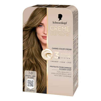 Schwarzkopf Creme Supreme 7-0 Natural Dark Blonde er en plejende hårfarve, der giver et naturligt og ensartet resultat i en mørk blond nuance. Med Schwarzkopfs 3x Bonding HaptIQ System forberedes, beskyttes og styrkes håret under hele farveprocessen, så det efterlades glansfuldt og modstandsdygtigt. Farven dækker op til 100 % gråt hår og holder længe.