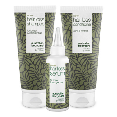 Australian Bodycare 3 Hair Loss Products er en komplet hårplejeløsning til dig, der oplever tyndt hår, hårtab eller en vigende hårgrænse. Sættet indeholder shampoo, balsam og serum, som tilsammen hjælper med at opretholde en balanceret hovedbund og styrke håret fra rod til spids. Hårprodukterne er velegnede til daglig brug og kan anvendes af både mænd og kvinder. Biotin og Capilia Longa understøtter hårets naturlige vækstbetingelser og giver synligt stærkere hår over tid.