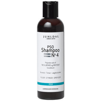 Juhldal PSO Shampoo No 4 indeholder naturligt bromelin (2,2%) og aktive urter som timian, lægekulsukker og palmelilje, som særligt hjælper en tør, kløende og irriteret hovedbund.