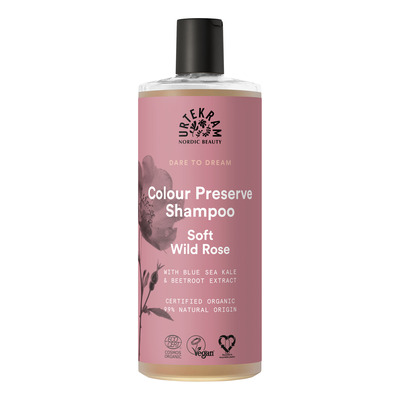 Urtekram Dare to Dream Soft Wild Rose Colour Preserve Shampoo er en nærende shampoo til daglig pleje af farvet hår. Shampooen er formuleret med fugtgivende aloe vera og glycerin, som sørger for, at hår og hovedbund forbliver velplejet. Ydermere indeholder Soft Wild Rose Colour Preserve Shampoo strandkål og rødbedeekstrakt, som er med til at bevare farven i dit hår og samtidig får håret til at se friskt og levende ud. Shampooen har en mild, forfriskende duft af vilde roser, som efterlader håret med en skøn duft.