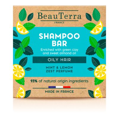 Denne Shampoobar fra BeauTerra er specielt udviklet til fedtet og olieret hår. Shampoobaren er fremstillet hos en sæbeproducent i hjertet af det franske område Haute Provence. Baren er forsynet med plastemballage og er et praktisk og økologisk alternativ til din normale flydende shampoo. Denne shampoo variant til fedtet hår er lavet med grøn ler og sød mandelolie og har en frisk duft af pebermynte og citronskal.