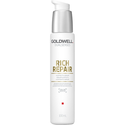 Goldwell Dualsenses Rich Repair 6 Effects Serum er et genopbyggende serum til tørt og skadet hår. Serummet trænger dybt ind i håret for at genopbygge beskadiget hår. Dette hårserum har 6 genopbyggende fordele; modvirker at håret knækker, mindsker spaltede spidser, giver silkeblødt og medgørligt hår, øger elasticiteten, opfrisker hårets længder og spidser, tilfører glans og styrker håret.