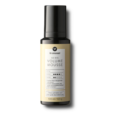 HH Simonsen Volume Mousse giver volumen og tekstur til alle hårtyper, samtidig med at håret forbliver let og luftigt. Den indeholder fibre, der opbygger sig omkring hårstråene, hvilket skaber en tykkere og fyldigere følelse. Hvedeproteiner beskytter og styrker håret, mens den UV-beskyttende formel hjælper med at skærme håret mod solskader.