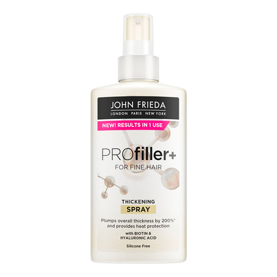 John Frieda ProFiller+ Thickening Spray har en let formel, som ikke tynger håret ned. Den efterlader håret fleksibelt og fyldigt, samtidig med at den reducerer hårtab forårsaget af brud. Produktet er vegansk og fri for silikone.