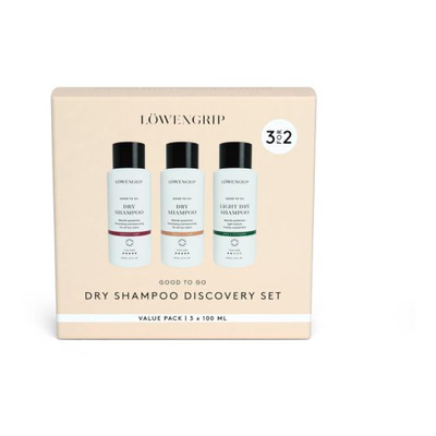 Löwengrip Good To Go Dry Shampoo Discovery Set er en pakke med tre tørshampooer i rejsestørrelse fra Löwengrips prisvindende Good To Go-serie. Sættet indeholder Good To Go Dry Shampoo i duftvarianterne Jasmine & Amber og Caramel & Cream samt Good To Go Light Dry Shampoo med Apple & Cedarwood-duft.