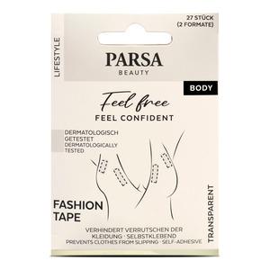 Parsa Beauty Fashion Tape leveres i to forskellige formater, så du kan vælge den type, der passer bedst til dit outfit. De 27 strips i pakken gør det muligt at bruge tapen flere gange. Ideel til udskæringer, skjorter og stropløse styles.