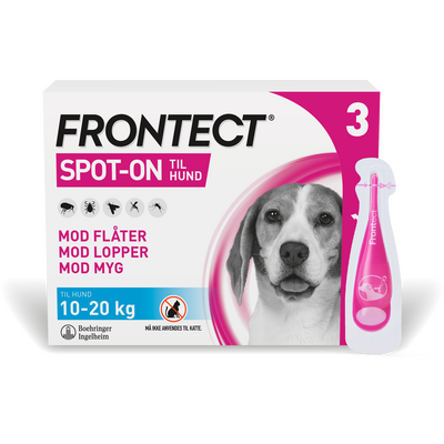 Frontect Spot On til hunde giver langvarig beskyttelse mod flyvende insekter så som myg, sandfluer og stikfluer samt mod lopper og flåter. Den dræber nye lopper og flåter, som har sat sig fast på din hund, og beskytter derudover også mod evt. fremtidige lopper og flåter. Frontect bruges hver 4. uge og afviser flåter i 4 uger, så risikoen for flåtbårne sygdomme reduceres. Derudover afviser den bid fra flyvende insekter i op til 5 uger samt forebygger loppeangreb i 4 uger.