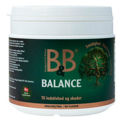 B&B Balance er et tilskudsfoder til hunde, der indeholder tre forskellige typer hydrolyserede kollagenpeptider: CPF 218, CPT 202 og CPB 227. Disse kollagentyper forekommer naturligt i hundens krop og indgår blandt andet i brusk, muskler, sener og ledbånd. Pulveret er smagsneutralt og uden tilsætningsstoffer. Det kan anvendes som en del af den daglige fodring og gives sammen med hundens almindelige foder.