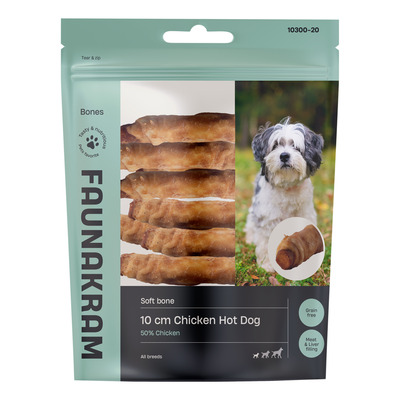 Faunakram 10 cm Chicken Hot Dog med leverfyld er en velsmagende snack udviklet til mindre hunderacer. Produktet består af kyllingefars lavet på kyllingekød og kyllingelever, som er omviklet med råhud. Kombinationen af 50 % kyllingefars og 40 % råhud giver både ernæringsmæssig værdi og tyggeglæde. Godbidden er velegnet som en daglig snack eller som ekstra forkælelse i hverdagen.