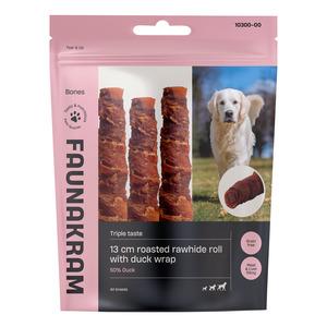 Faunakram 13 cm Roasted Rawhide Roll with Duck Wrap, Liver Filling er en velsmagende tyggerulle til mindre og mellemstore hunde. Den består af ristet råhud med en blød fyldning af andekød og andelever og er derefter omviklet med rent andekød. Produktet indeholder 50 % and og 40 % råhud, hvilket giver din hund både tyggeglæde og god smag. Godbidden fungerer som et lækkert supplement i hverdagen og er velegnet til hunde, der nyder længere tyggetid.