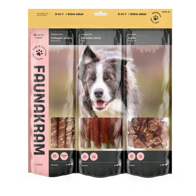 Faunakram Dog 3-in-1 Duck er en 600 grams valuepack med tre forskellige typer hundesnacks, alle med and og torsk. Pakken indeholder bløde godbidder med and og torsk, råhudsben med andekød samt collagen tyggepinde med and og torsk. Sammensætningen gør produktet ideelt både som belønning under træning og som længerevarende tyggeaktivitet. En praktisk løsning for dig, der ønsker variation og høj smagelighed.