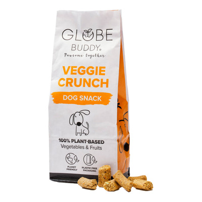 Globe Buddy Veggie Crunch er plantebaserede og 100% veganske godbidder til voksne hunde. Snacksene indeholder naturlige ingredienser som græskar, pastinak, æble og banan, og har en sprød konsistens, som mange hunde foretrækker. Godbidderne er kornfri, uden tilsat sukker og helt fri for kunstige smagsstoffer og konserveringsmidler. De er certificeret af The Vegan Society.