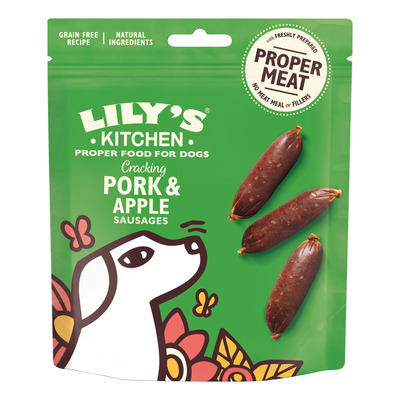 Lily´s Kitchen Cracking Pork & Apple Sausages for Dogs som både dufter og ser lækre ud