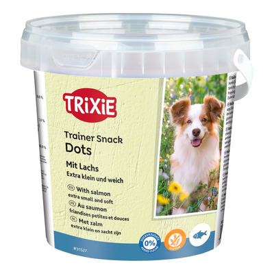 Mini Trainer Dots fra Trixie - Hundegodbidder med smag af laks i en praktisk spand