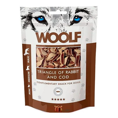 Woolf præsenterer Triangle of Rabbit & Cod, en unik blanding af kanin og torsk formet som små trekanter, der er perfekte til træning. Disse snacks er skabt af 100% proteinkilder for at sikre den højeste kvalitet og det bedste ernæringsindtag for din hund. Efter tilberedning pakkes disse Woolf snacks uden tilsætning af kemiske tilsætningsstoffer, konserveringsmidler eller farvestoffer, hvilket gør dem til en sikker og sund snack for hunde i alle størrelser, inklusive små hunde, og de er også velegnede til katte.