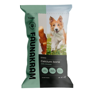 Faunakram kalk-tyggeben overtrukket m. kylling er et lækkert og sejt tyggeben, der er velegnet til små/medium hunde