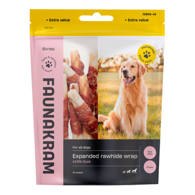 Faunakram lækre råhudspinde m. and er velsmagende tyggepinde, der kan hjælpe på din hunds tandhygiejne