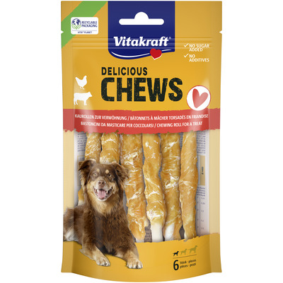Vitakraft Deli Chews tyggeben med kylling er fedtfattige og lavet af tørret oksehud, der er tæt pakket ind i kylling. Disse tyggeben er fremstillet uden kunstige smagsforstærkere, farve- og konserveringsmidler, hvilket gør dem til et sundt valg for din hund. Tyggebenene styrker din hunds tyggemuskler, mens den spiser, og sikrer sund tandpleje. Vitakraft Deli Chews tyggeben med kylling er velegnet til små hunde og giver din hund en smagfuld oplevelse. Disse tyggeben er en sjov måde at sikre god mundhygiejne og sunde tænder på. Perfekte til daglig brug og som en lækker belønning.