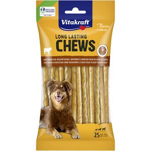 Vitakraft Long Lasting Chews Tyggestænger er lavet af 100% tørret oksehud. Disse drejede tyggestænger er et godt supplement til det daglige foder. Vitakraft Long Lasting Chews er fremstillet uden kunstige smagsforstærkere, farve- og konserveringsmidler, hvilket gør dem til et sundt valg for din hund.Vitakraft Long Lasting Chews styrker din hunds tyggemuskler, mens den nyder smagen. Posen indeholder 25 tyggestænger, der fremmer sund tandpleje og giver din hund en sjov tyggeoplevelse. Velegnet til alle hunde.