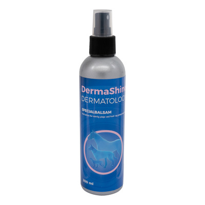 DermaShine Balsam er en enestående løsning for hunde, katte og heste med tør hud og pels. Denne specielle balsam genopretter pelsens naturlige fugtighedsbalance og giver en sund glans uden at virke fedtet. Med nøgleingredienser som jojobaolie, der trækker fugtighed ned i huden, bliver huden blød og smidig, mens skæl løsnes fra hudoverfladen. Yderligere fugtgivende komponenter som propylenglykol og glycerin bidrager til en mild desinficerende effekt, mens mælkesyre normaliserer hudens pH-værdi.