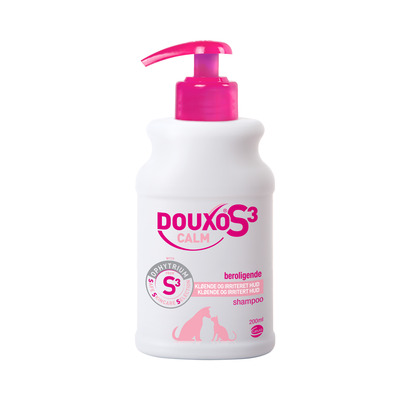 Denne S3 Calm Shampoo fra Douxo er velegnet til hund, kat og hest med en tør og sensitiv hud. Shampooen genopretter balancen i huden samt plejer og beroliger huden. Shampooen har en skøn og mild duft af kokos og vanilje og renser skånsomt hud og pels. Calm Shampooen er uden sæbe, sulfat, parabener, nanopartikler, farvestof samt ftalater, og har en pH-værdi tilpasset til dyrets hud.