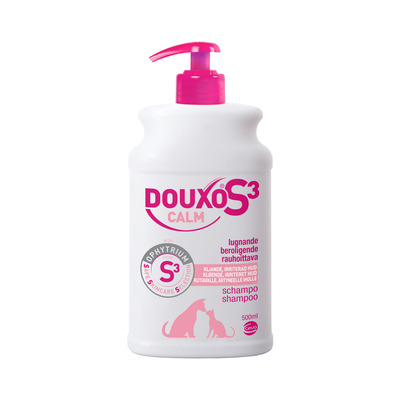 Denne S3 Calm Shampoo fra Douxo er velegnet til hund, kat og hest med en tør og sensitiv hud. Shampooen genopretter balancen i huden samt plejer og beroliger huden. Shampooen har en skøn og mild duft af kokos og vanilje og renser skånsomt hud og pels. Calm Shampooen er uden sæbe, sulfat, parabener, nanopartikler, farvestof samt ftalater, og har en pH-værdi tilpasset til dyrets hud.