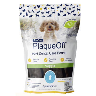 Vil du fjerne eksisterende tandsten og forebygge dannelsen af ny plak hos din hund? Så er Swedencare PlaqueOff Mini Dental Bones lige noget for dig! Tyggeknoglerne er særligt udviklet til små hunderacer og er de eneste på markedet, der indeholder den naturlige og klinisk dokumenterede algeingrediens, AN ProDen®, som effektivt hjælper på plak og tandsten.