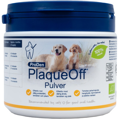 Swedencare PlaqueOff pulver er et naturligt fodertilskud til hunde, der er klinisk bevist til at reducere tandsten og plak. Udover de tandrensende egenskaber er fodertilskuddet også udviklet til at forbedre dårlig ånde hos din hund. Resultatet ses normalt allerede efter 3-8 ugers regelmæssigt brug, når det indtages én gang dagligt sammen med et måltid.