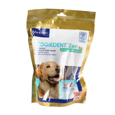 Dette kombinationsprodukt fra Virbac er et perfekt supplement til daglig tandbørstning, da tyggepindene reducerer plak og tandsten samt bekæmper dårlig ånde hos din hund. Virbac VeggieDent Zen er tyggepinde med en unik z-form, som sikrer en grundig rengøring af alle tænderne, og ydermere træner din hunds kæbemuskler. Tyggepindene er desuden tilsat koncentrat af grøn te, som er en kilde til L-theanin, der virker beroligende på hunden ved stressende eller ukendte situationer.