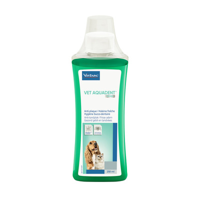 Daglig dental og oral hygiejne hos hunde og katte. Tilføres dagligt dyrets drikkevand. Tilfør 2,5 ml Vet Aquadent for hver 250 ml vand.