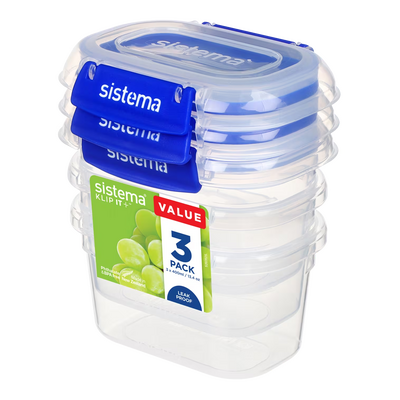 Sistema Klip It Plus Rectangle 3 pack 400 ml er en pakke med tre identiske rektangulære opbevaringsbokse i gennemsigtigt plast med blå låseclips. Hver boks rummer 400 ml og er velegnet til opbevaring af rester, grøntsager, frugtstykker og andre madvarer i køleskab eller fryser. Boksene er udstyret med Sistemas patenterede låseclips og fleksibel forsegling, der holder indholdet frisk i længere tid.