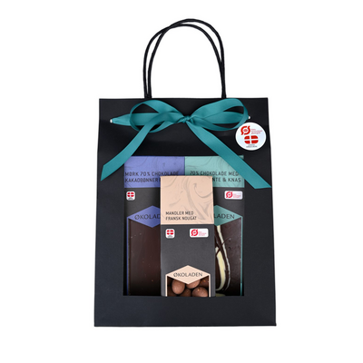 Økoladens chokolade er altid økologisk og håndlavet for at sikre produkter af absolut højeste kvalitet! Denne fine, blå gavepose fra det danske firma, indeholder 5 utroligt delikate chokolade- og marcipansnacks. Økoladen bruger altid de bedste økologiske råvarer, og kombinerer fantastisk smag med godt håndværk.