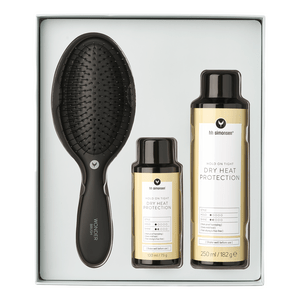 HH Simonsen Dry Heat Protection Gift Box indeholder to størrelser af den effektive varmebeskyttende spray samt en skånsom Wonder Brush. Dry Heat Protection beskytter håret mod varme op til 210 °C og skaber en usynlig barriere, der forsegler håret og reducerer krus. Den hurtigtørrende formel tilfører glans og gør håret blødt og medgørligt. Sprayen er velegnet til alle hårtyper og perfekt før brug af glatte- eller krøllejern.