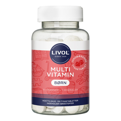 Livol Multivitamin Børn med jordbærsmag dækker barnets daglige vitamin- og mineralbehov. Tyggetabletten har en dejlig, sød smag af jordbær, som dit barn vil elske at tygge på. Tyggetabletterne indeholder i alt 11 vitaminer og 5 forskellige mineraler.