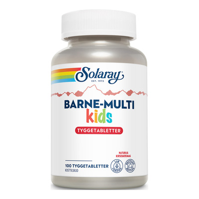 Barne-Multi fra Solaray er et kosttilskud til børn i form af lækre tyggetabletter, som gør det nemt at give dit barn et dagligt tilskud. Tyggetabletterne har desuden en skøn smag af kirsebær, som de fleste børn vil elske. Barne-Multi indeholder 12 forskellige vitaminer, og endvidere er jern også tilsat. Derudover "ligger" det i en urteblanding af citron, acerola, hyben og kelp.