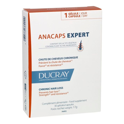 Ducray Anacaps Expert er et vegansk og glutenfrit kosttilskud, der hjælper med at modvirke kronisk hårtab hos mænd og kvinder. Den avancerede formel indeholder plantebaserede aktive ingredienser, aminosyrer, vitaminer og mineraler, heriblandt zink, jern, vitamin B og L-cystein, som bidrager til at styrke håret indefra og gør det mere modstandsdygtigt. Kosttilskuddet understøtter hårbundens mikrocirkulation, hvilket bidrager til hårvækst.