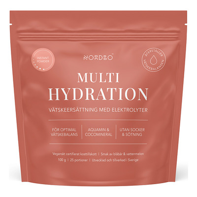 NORDBO Multi Hydration er en komplet væskeerstatning til alle lejligheder, hvor kroppens væskebalance har brug for at blive genoprettet. Dette pulver er usødet og har en forfriskende smag af vandmelon og blåbær. Det naturlige indhold af mineraler hjælper med at opretholde kroppens normale elektrolytbalance. Multi Hydration indeholder bl.a. aquamin, der er udvundet af mineralrige rødalger, vandmelonpulver, magnesium og himalayasalt.