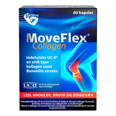 Biosym MoveFlex Collagen er et specialprodukt med et indhold til gavn for led, knogler, brusk og bindevæv. Kosttilskuddet er nøje sammensat med udvalgte ingredienser i unik kombination, og er særligt velegnet til dig, der lever en aktiv livsstil - eller som ønsker mere bevægelse i hverdagen. MoveFlex Collagen indeholder nemlig en særlig form for udenatureret og patenteret type 2 kollagen fra kyllingebrystben (UC-II). At det er udenatureret betyder, at kollagenets naturlige og oprindelige struktur bevares igennem den skånsomme fremstillingsproces. Det betyder ligeledes, at kollagenet optages effektivt i kroppen.