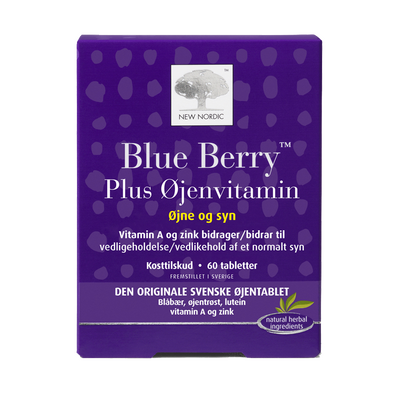 Vores øjne har brug for særlige næringsstoffer for at kunne fungere optimalt. De specielt udvalgte mikronæringsstoffer og urteekstrakter i hver tablet af New Nordic Blue Berry Plus giver næring til dine øjne. Tabletten, som er fremstillet i Sverige, indeholder blåbær, øjentrøst og tagetsblomstekstrakt - som fremstilles ved en helt særlig proces, således indholdet af lutein standardiseres. Ydermere bidrager indholdet af vitamin A og zink til opretholdelsen af et normalt syn.