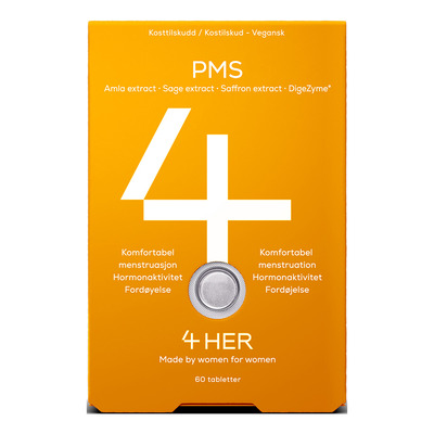 Kosttilskud til PMS. Til kvinder, der ønsker lindring af gener såsom humørsvingninger, ubehag og oppustethed. 4HER PMS indeholder bl.a. safran og salvie, som kan bidrage til velvære og normal menstruation. Safran kan også bidrage til følelsesmæssig balance. Amla og salvie kan understøtte fordøjelsen. B6-vitamin bidrager til at regulere hormonaktiviteten og til en normal psykologisk funktion.