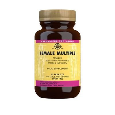 Solgar Female Multiple er et kosttilskud i tabletform sammensat specielt til kvinden. Det indeholder en række udvalgte næringsstoffer - herunder vitamin vitamin C og E, som begge er kraftige antioxidanter og beskytter kroppens celler mod oxidativ stress, vitamin B1, B2, B3, B12 samt mineralerne calcium, jod, zink og magnesium.